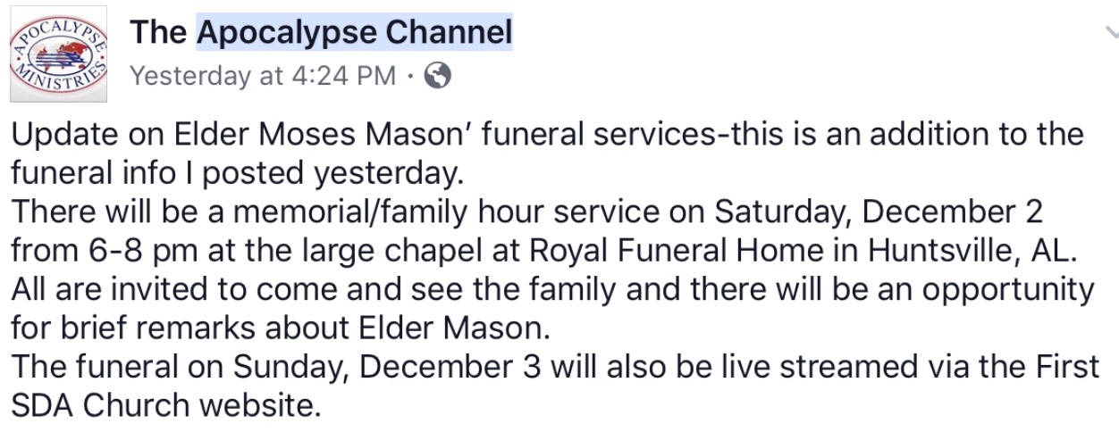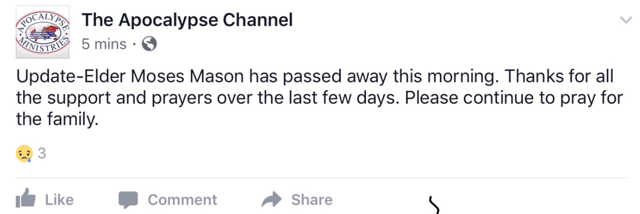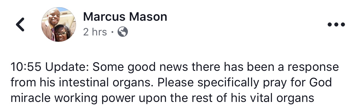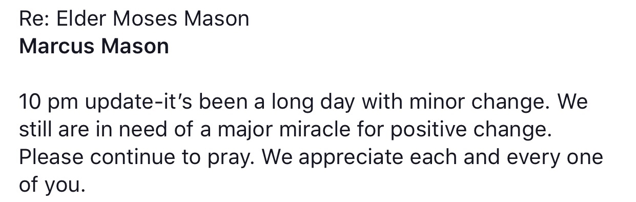 We have learned of the passing of our dear elder, may he Rest In Peace. Our heavenly Fathers knows what’s best. We thank all for their prayers. Let’s continue to pray for the family.